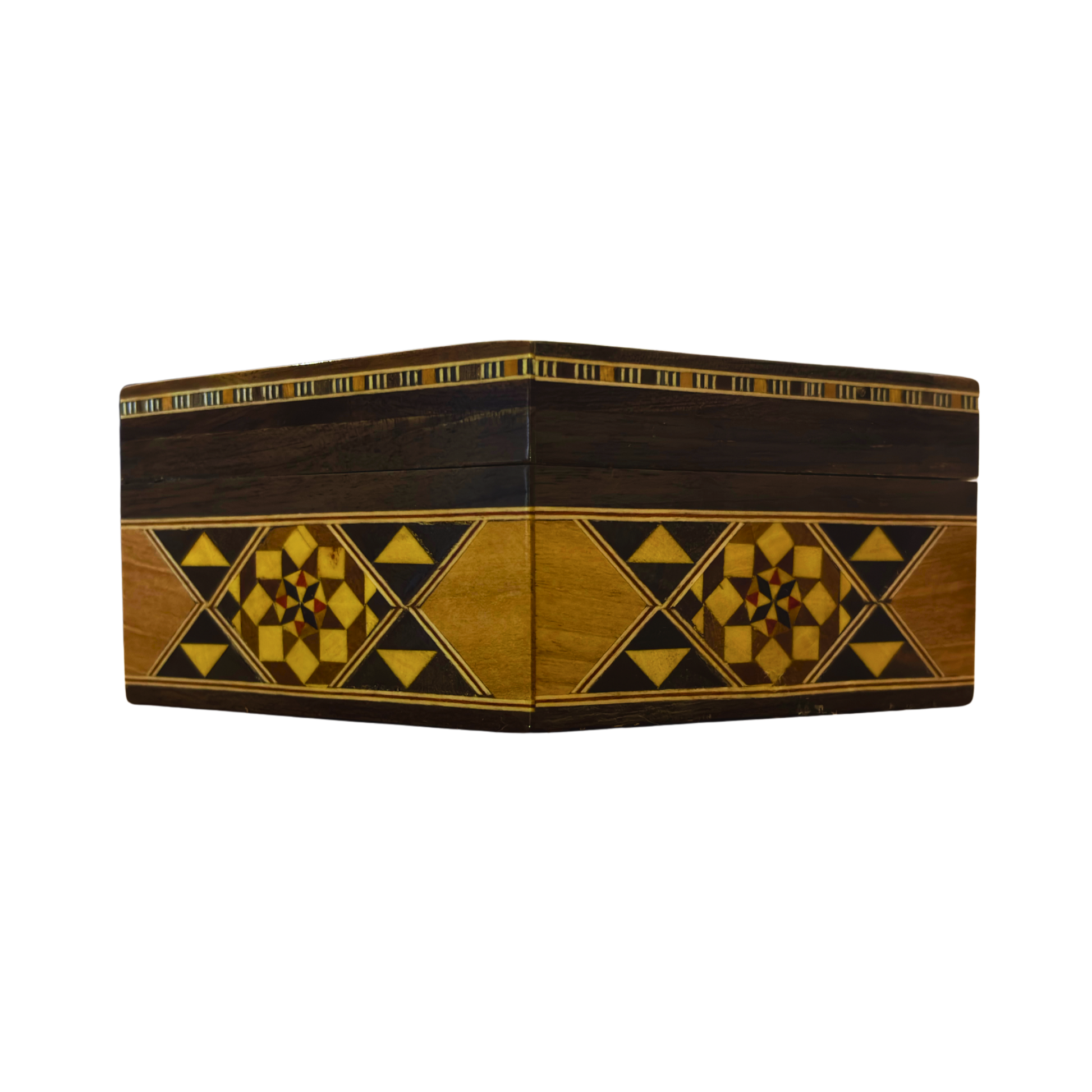 Realizzata a mano con noce, faggio, legno di rosa e legno di limone, questa scatola damascena presenta raffinate intarsiature in vera madreperla e un’estetica di alta artigianalità.