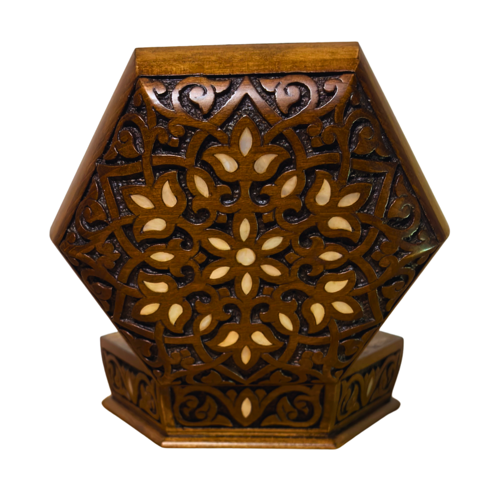 This elegant hand-carved box represents a refined level of Syrian craftsmanship, positioned just below the prestigious Mashghal Arabi tradition. Each piece is carefully carved by hand and enriched with authentic mother of pearl inlay, reflecting both precision and heritage.