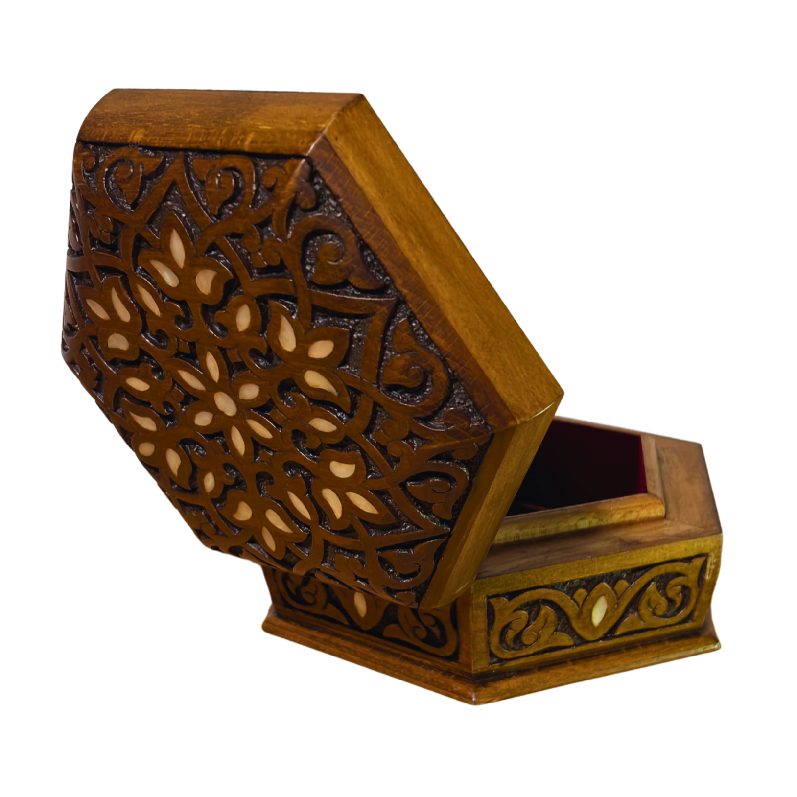 Finished in a light walnut tone, the hexagonal form highlights the depth of the carving and the natural beauty of the wood. The interior is lined with luxurious wine-red velvet, offering elegant protection for jewelry, keepsakes, or treasured personal items.
