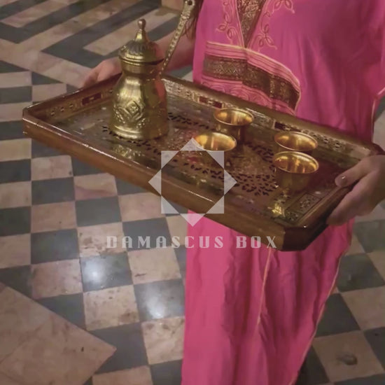 This exquisite handcrafted mosaic tray showcases the artistry of traditional Damascene craftsmanship at its finest.